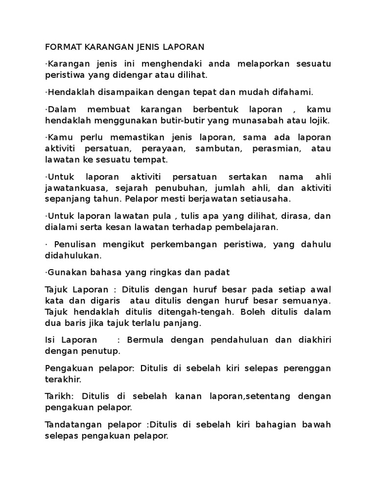 . Laporan format karangan pula adalah laporan yang kebiasaanya ditulis oleh setiausaha program Format laporan jenis ini adalah lebih panjang dan menggambarkan keseluruhan aktiviti yang dijalankan. The America Desk Dictionary menurut kamus di Amerika artikel merupakan bagian dari tulisan nonfiksi dengan bentuk bebas merupakan bagian penerbitan seperti laporan esai. Kertas 1 Bahasa Melayu Mulai tahun 2021 Kertas 1 mata pelajaran Bahasa Melayu dalam peperiksaan SPM 11031 akan menggunakan format baharu.